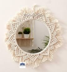 Bring warmth and style to your space with this handcrafted macramé round wall mirror. Framed with intricate cotton knot work and fringes, it’s perfect for adding a boho-chic touch to your living room, bedroom, hallway, or entryway.